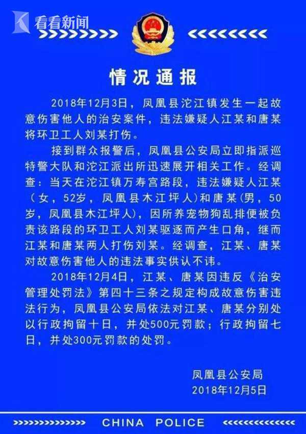 12月5日,凤凰县公安局发布通报称,经调查,当天在沱江镇万寿宫路段,违法嫌疑人江某(女,52岁,凤凰县木江坪人)和唐某(男,50岁,凤凰县木江坪人),因所养宠物狗乱排便被负责该路段的环卫工人刘某驱逐而产生口角,继而江某和唐某两人打伤刘某。江某和唐某两人也对故意伤害他人的违法事实供认不讳。