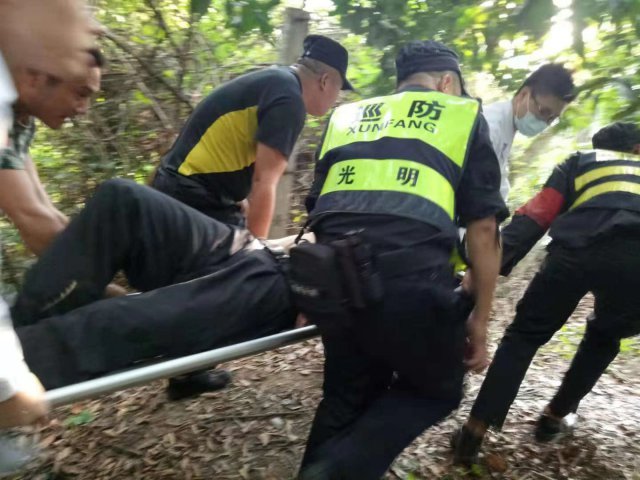 红花山公园树木密布、杂草丛生,民警想要找到一个有可能已经昏迷的人并不容易。搜救警力到达红花山后,迅速开展地毯式的搜山行动。与此同时,民警不间断地拨打罗先生电话,希望罗先生接听或是听到手机的铃声。就在连续几十个电话后,手机终于接通了,但罗先生已经话语不清,只能发出微弱的呻吟声,手机中还隐约传来几声狗叫声。" 有狗叫声?我知道在哪了!" 得知电话中的情形,巡逻队长陆建明大喊一声,立刻带着几个巡逻队员赶了过去。在陆建明的带领下,巡逻警力于 16 时许成功在一堆杂草中找到了已经昏迷的罗先生。