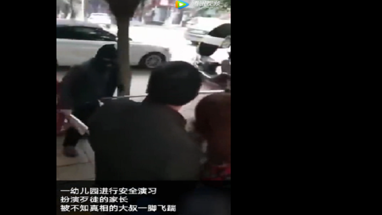 近日,重庆市永川区一幼儿园进行防暴演练时,一名安保人员用钢叉控制了由家长扮演的歹徒,这一幕正好被一位路人看到了,这位正义感爆棚的男子误以为真的发生了歹徒袭击幼儿园的暴力事件,二话不说,对着假扮的歹徒飞起就是一脚,将其踢翻在地。周围的工作人员急忙解释"演习演习是演习!"这位男子才不好意思地向地上的"歹徒"致歉:原来是演习啊,把我吓了一跳!