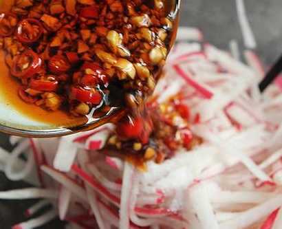 【材料】:水萝卜 2根、香菜 适量、蒜 4瓣、小米椒 3个、白糖 2茶匙、花椒油 半汤匙、辣椒油 2汤匙、香醋 2汤匙、生抽 2汤匙、盐 1茶匙