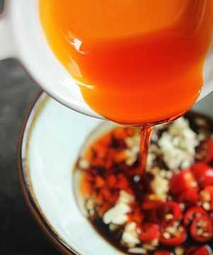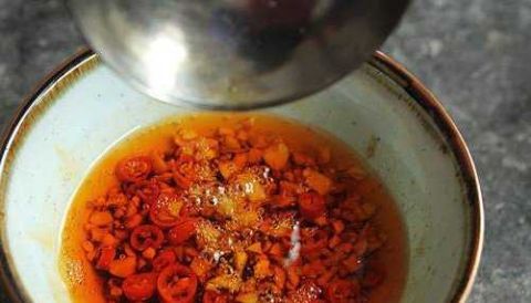5、烧一些热油,淋入碗内迅速搅拌均匀;