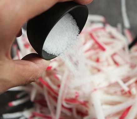 2、再切细丝,然后放入1茶匙盐抓匀,放置20分钟沙出水分,然后挤干水,备用;