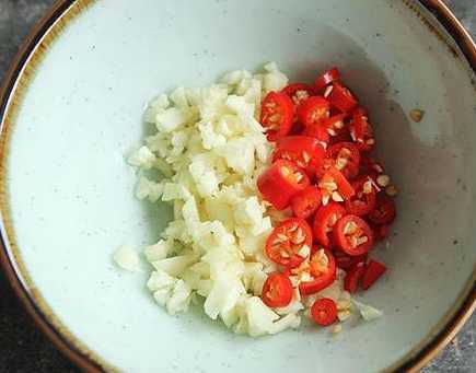 3、把蒜和辣椒剁碎,喜欢吃辣的可以多放点辣椒;