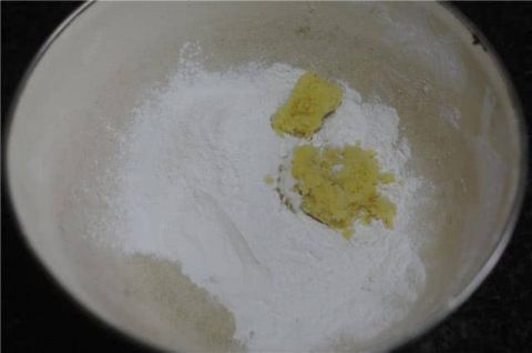 挖一大勺姜末放在糯米粉中,姜末的量可以随意,不用特别按食谱来,喜欢吃辣的就多放点。