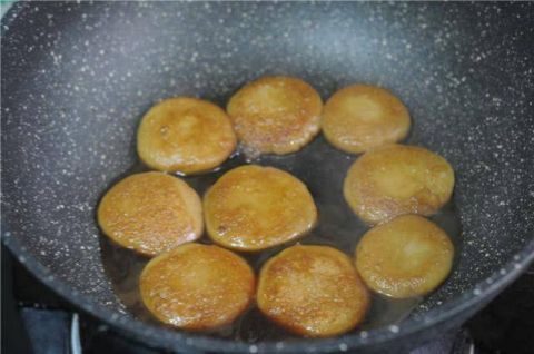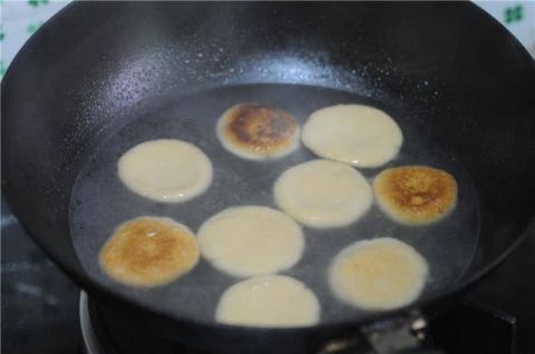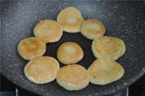 将煮好后的糯米饼取出来,倒掉水,锅底烧干后倒入少许油,转小火,将糯米饼一个个摆放进锅里,小火慢慢将两面都煎至微微变黄。煎的过程中要防止相邻的两个饼边缘粘连。