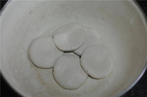 将粉团搓长条后,分成差不多大的五份,搓圆后放在手心,双手压成圆饼。