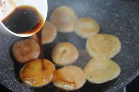 煎至锅里的水汽都变干,饼两面都微微变黄后,淋入红糖水。
