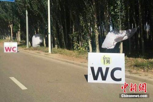 两棵树间系一块布帘,再摆上一块牌子,就成了赛时厕所;风一吹,布帘随风飘动,如厕者脸红又无奈。