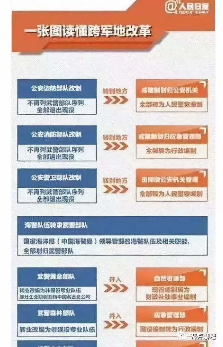人民日报发了张这样的图,图中表示:公安边防和公安警卫部队将进行改制,转到地方由统计公安机关管理,全部转为人民警察编制!而公安消防部队改制,成建制应急管理部,转为行政编制公务员!
