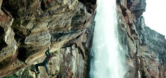 影片中一段徒手攀岩的瀑布叫安赫尔瀑布,是世界上落差第一大的瀑布,落差达979米。瀑布底下遮掩,只有乘坐飞机才能一睹它神秘的雄姿。两名演员在陡峭岩壁上攀登,身体悬于空中,让观众们都替他们捏一把冷汗。一名有着22年攀岩经验的替身直言全靠冥想来克服恐惧。