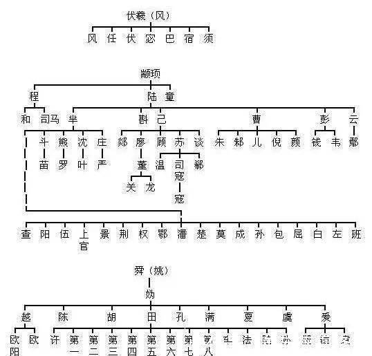 颛顼,传说起皇帝的孙子,所以也姓“姬”,然后他又衍生出了许多今天我们比较常见的姓氏。通过小编的介绍还有上面的图表,你们有没有找到自己的姓氏呀?找不到的话也不要气馁,毕竟我们华夏民族这么多人口,再说小编说的这些姓氏也只是上古比较有名的姓氏演变出来的一部分姓氏而已,也有许多没有被记录的姓氏,还有就是人口分布不均匀,战争不断,地域复杂,姓氏的收录会不完全。大家感兴趣的话可以继续追查自己的姓氏来源,说不定会有意想不到的惊喜呢!