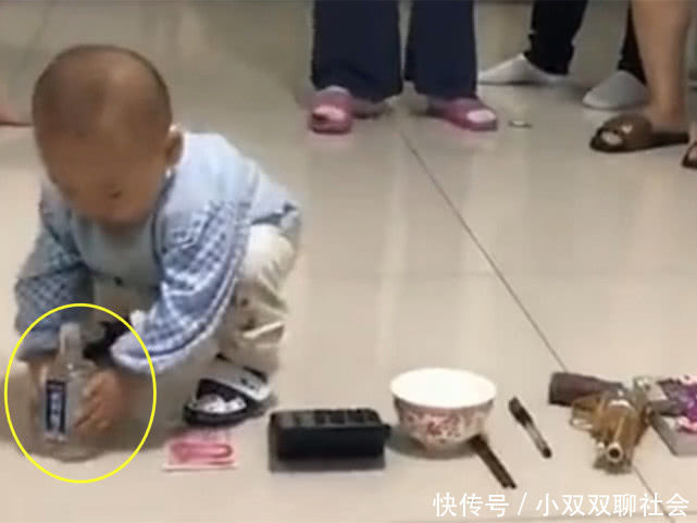在众人的注视下,宝宝特别果断地走到了这堆物品的旁边,并且毫不犹豫地选择了摆在最边缘的一瓶白酒。