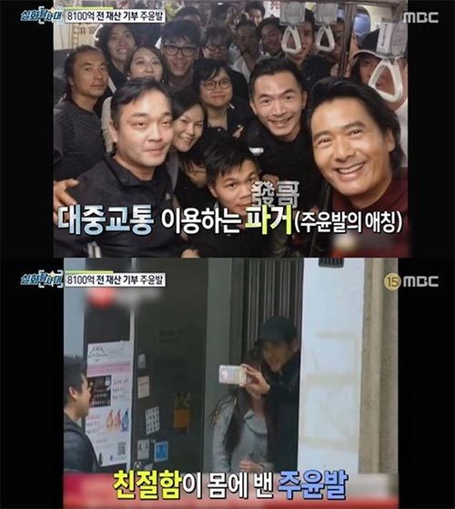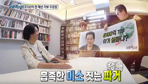 采访开始之前,韩国节目组先为周润发送上了一面横幅,并用中文致敬道:“韩元8100亿(约人民币50亿)的捐助,世界上最帅的慈善天使。发哥:我们佩服,我们敬重!”并一齐鞠了一躬。周润发也用韩语礼貌致谢。节目组人员全程用中文采访了周润发。