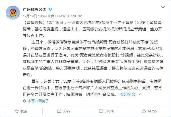 12月19日,广州越秀公安再发布通报,回应“死者被殴打并被扔下楼”等质疑: