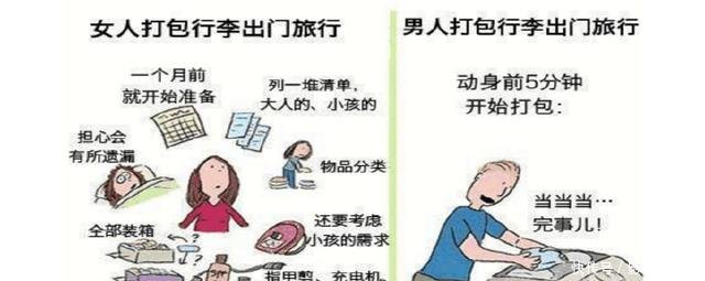 在对于外出前的准备女人会更加的不同而繁琐,提前一个月就开始做好出行准备,事无巨细,无论是自己还是家人可能在旅途中遇到的东西,所以清单一大堆,行李箱也是满满当当重的要命。而男人则不同,任何时候随机而行,他们总能来次说走就走的旅行,一套换洗的衣服和洗漱用具足以拎包即可出现。不能说哪个更好,只是确实存在不同而造成了时间上的不等。不是男人快,只是男人不理解,不是女人慢,只是她需求可能会更多,所有的人和事都是互补的,就因为男人的大条才需要身边有个人帮忙打理生活细节,而女人也只有遇到一个大条的男人,才能包容她的小纠结情绪,若男人和女人一样,恐怕会多出很多细节的冲突和对立,不管怎样只要有爱,任何问题都不是问题。