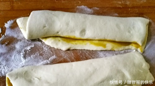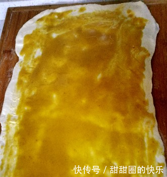 4.一般如果做东北油盐烧饼就把发好的面,擀成大片,把油酥涂上去,然后卷成卷。