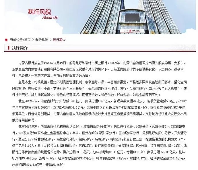 截至2017年末,内蒙古银行资产总额1267亿元。