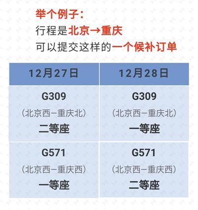 例如:行程是北京始发重庆终到,用户可提交这样一个候补订单:12月27日的G309次列车(北京西-重庆北)二等座,G571次列车(北京西-重庆西)一等座;12月28日的G309次列车(北京西-重庆北)一等座,G571次列车(北京西-重庆西)二等座。