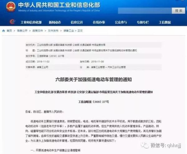 2018年11月8日,国家六个部委:工业和信息化部、发展和改革委员会、科学技术部、公安部、交通部和市场监管总局联合发布了一份关于加强低速电动车管理的通知,将严格监管或禁止低速电动车。
