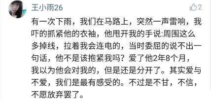 快要结婚的时候,那个时候知道他的家庭情况不是很好,但是我爸妈不肯没有彩礼把我嫁过去,怕我受委屈,但是因为我铁了心的不要彩礼,所以爸妈也就无奈同意。可是婚后婆婆总是跟别人说娶个媳妇多么的容易,也总是说我什么都不干,但是他明明听见过,明明知道,却也一句话都没有为我争辩过,甚至从来都没有在他的父母与我之间偏向过我。那个时候,我才知道也许他是爱你的,但是他的心里其实更爱的是他自己。