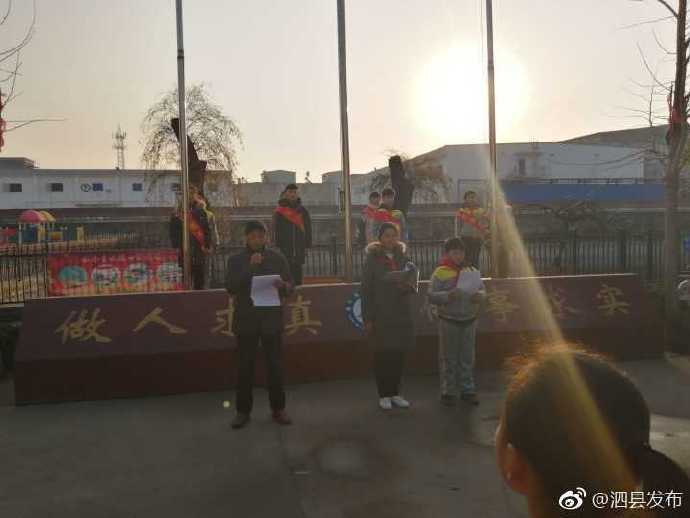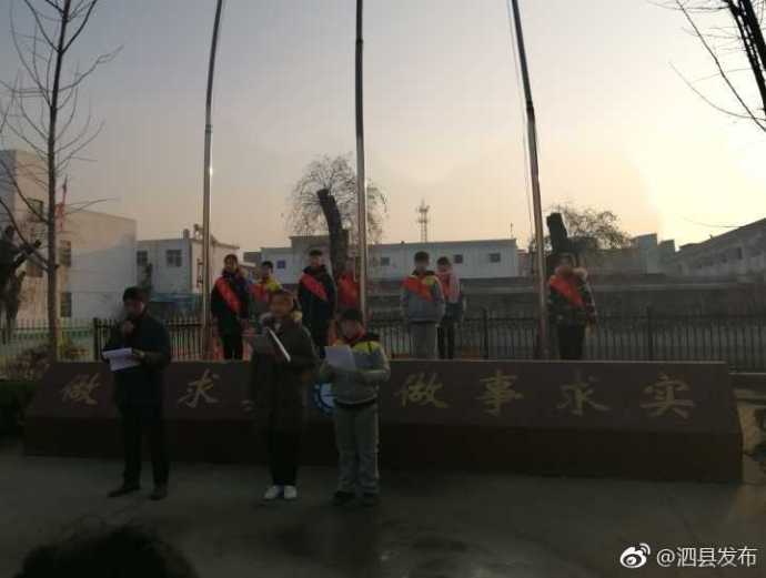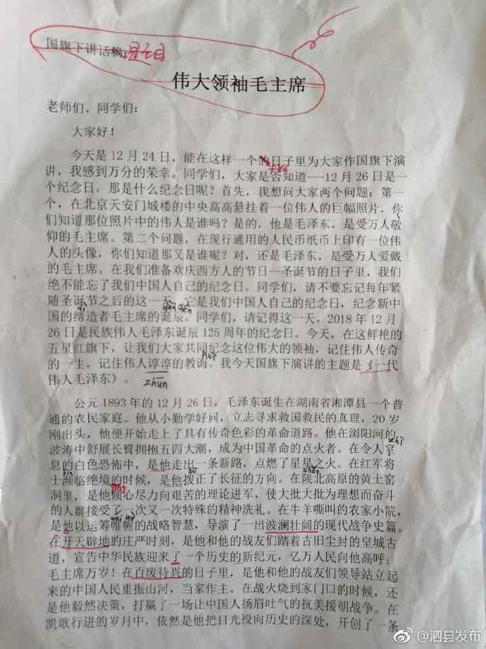 升旗仪式上,四(3)班学生进行了题为《伟大领袖毛主席》的国旗下讲话。毛泽东的一生是传奇的一生。从一个普通的农家孩子,成为中国革命的点火者,在令人窒息的白色恐怖中,是他走出了一条新路,点燃了星星之火。正是他领导中国人民重振山河、当家做主,也是因为他,才有了我们今天的幸福生活。所以作为新时代的小学生,我们要时刻铭记革命先辈的付出,好好学习,以实际行动向着奋进的目标前进。校长董学丰又进行了《圣诞节是中国人的耻辱》的讲话。他从中国屈辱的历史开始,告诉同学们所谓的圣诞节、平安夜、狂欢日的来历,也正是它带给了中国奇耻大辱。同时董学丰进一步号召所有学生要铭记伟人毛泽东,12月26日是毛泽东主席的诞辰日,只是(编者注:应为这是)一个值得我们所有中国人铭记的日子,不忘国耻,砥砺前行。
