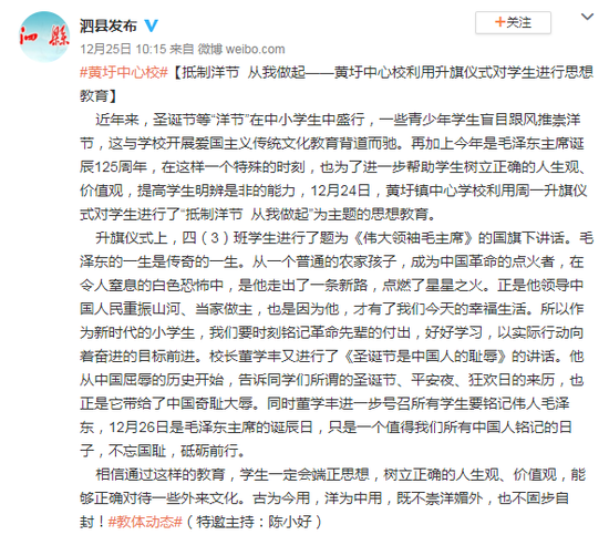 近年来,圣诞节等"洋节"在中小学生中盛行,一些青少年学生盲目跟风推崇洋节,这与学校开展爱国主义传统文化教育背道而驰。再加上今年是毛泽东主席诞辰125周年,在这样一个特殊的时刻,也为了进一步帮助学生树立正确的人生观、价值观,提高学生明辨是非的能力,12月24日,黄圩镇中心学校利用周一升旗仪式对学生进行了"抵制洋节 从我做起"为主题的思想教育。