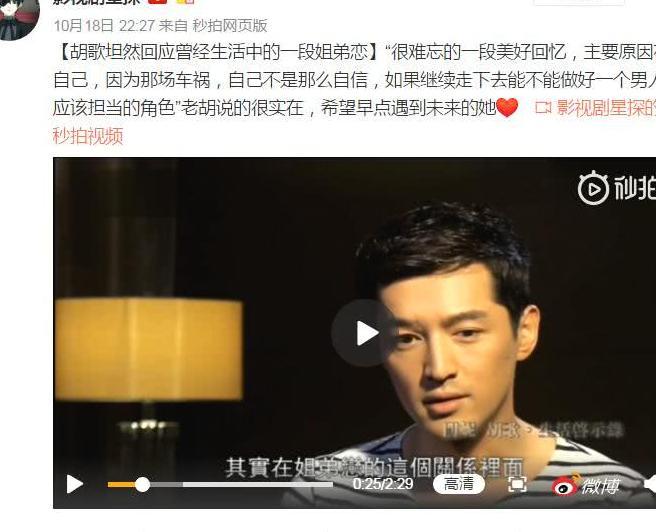 胡歌坦然回应曾经生活中的一段姐弟恋:“很难忘的一段美好回忆,主要原因在自己,因为那场车祸,自己不是那么自信,如果继续走下去能不能做好一个男人应该担当的角色”。希望胡歌能早点脱离单身吧。