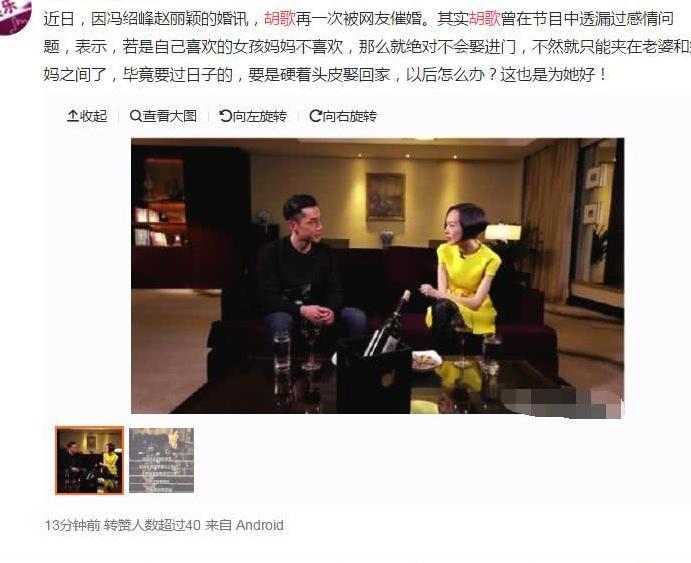 近日,因冯绍峰赵丽颖的婚讯,胡歌再一次被网友催婚。其实胡歌曾在节目中透漏过感情问题,表示,若是自己喜欢的女孩妈妈不喜欢,那么就绝对不会娶进门,不然就只能夹在老婆和妈妈之间了,毕竟要过日子的!
