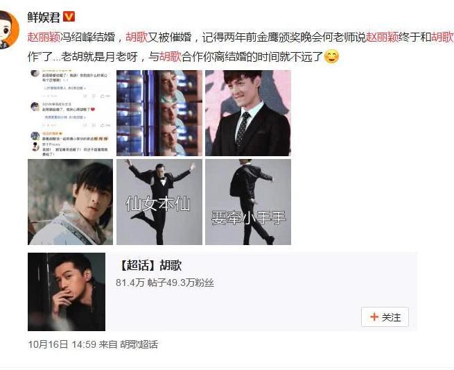 最近,有网友调侃:赵丽颖冯绍峰结婚,胡歌又被催婚,记得两年前金鹰颁奖晚会何老师说赵丽颖终于和胡歌“合作”了...老胡就是月老呀,与胡歌合作离结婚的时间就不远了啊。