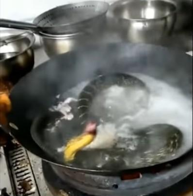 王老汉在外面忙了一上午了,肚子比较饿,因此为了省事,于是将这条捉到的蛇直接就丢到了滚烫的开水中,想着将蛇直接炖熟,然后加一些调料,自己就可以美美地吃上一顿饭了。然而事与愿违,当王老汉将蛇丢入滚烫开水之后,下一秒发生的事情,王老汉直接傻住!