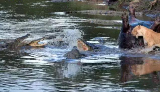 鳄鱼虽然不是鱼,但在水中力大无比,可能是母狮跟鳄鱼交过手站在水中就开始攻击鳄鱼,不料下一秒却让母狮后悔了,刚想扭头跑,却发现已经掉进了“贼窝”,突然冲水底又浮上来好几条大鳄,将母狮团团围住。结果我们看到了开始却没猜中结局,母狮竟然战胜了一群鳄鱼,在狮王的怒吼下吓得全都撤退,最后赢得了美味的晚餐。