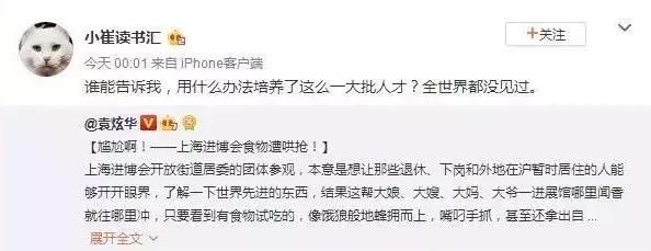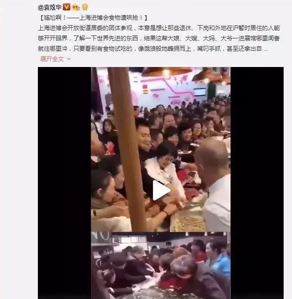 近两年,我国的中老年人不文明现象屡见不鲜。近日在中国举办的上海进博会上,又有不少中国的大妈们让人大跌眼镜,而这次又是为了哄抢食物!有博主把这段中国大妈哄抢食物的视频放在网上,崔永元看到后直接转发并怒骂称他们为“人才”!