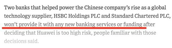 据知情人士称,在决定华为风险过高后,两家帮助推动中国公司作为全球技术供应商的崛起的银行——汇丰控股有限公司和渣打银行,将不会为其提供任何新的银行服务或资金。