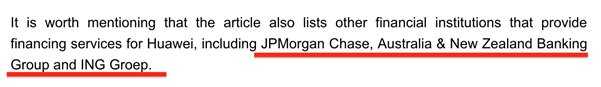 至于其他为华为提供过融资或服务的银行对是否会与华为达成新业务,目前还尚不能知。