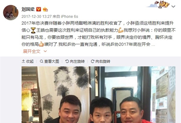 周所周知在刘国梁担任国乒主帅期间国乒实力一直处于霸主地位,虽然这么多年经历了无数挑战但是在刘国梁的带领下国乒一直统治者世界乒坛。而在刘国梁卸任后国乒遭遇了前所未有的失利尤其是在德国赛上的表现,更是可以用颜面扫地来形容。而在国乒遇挫之时王皓站了出来,王皓指挥弟子樊振东在年终总决赛中击败世界排名第一的奥恰洛夫完成了2017年的完美收官,而王皓的表现也得到了刘国梁的力挺。