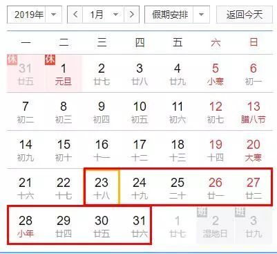 寒假 1 月 23 日(腊月十八)至 2 月19 日(正月十五),2 月 20 日(正月十六)开学;