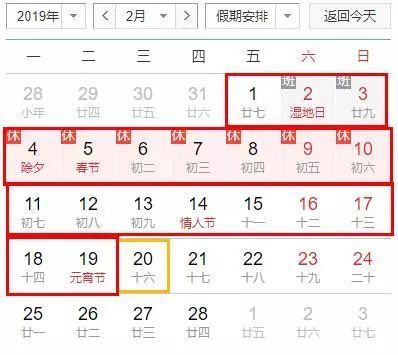 二、春节:2月4日至10日放假调休,共7天。2月2日(星期六)、2月3日(星期日)上班。