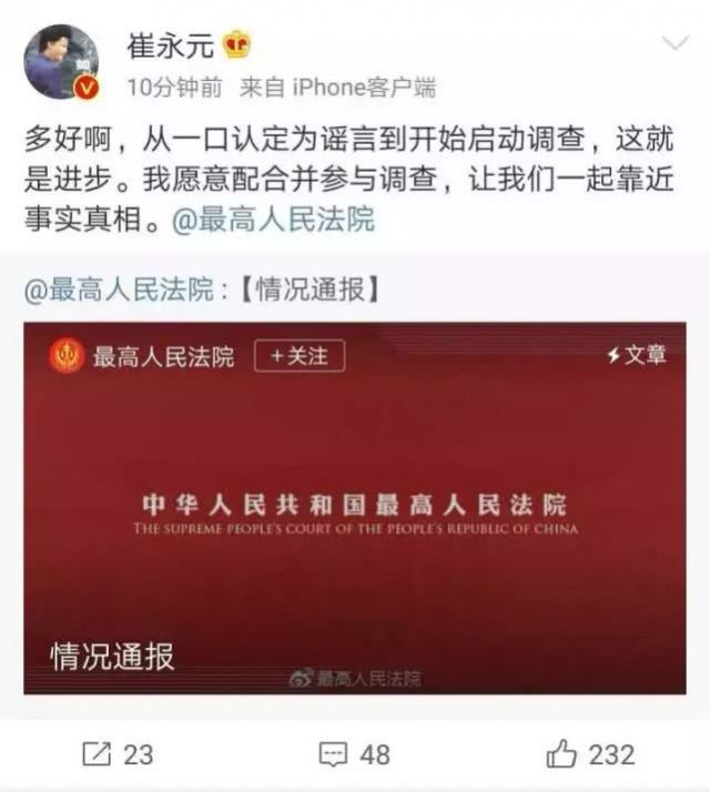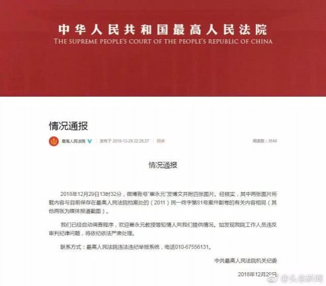 29 日晚,最高人民法院微博发布最新情况通报:其中两张图片所载内容与目前保存在最高人民法院档案处的副卷有关内容相同,已经启动调查程序,欢迎崔永元教授等知情人