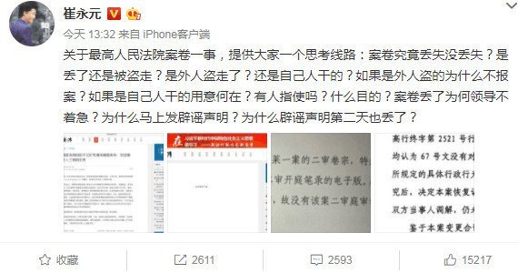 29 日,崔永元在微博贴图质疑 " 陕北千亿矿权案 " 卷宗在审理机关丢失:" 究竟丢失没丢失?是外人盗走了?还是自己人干的?"