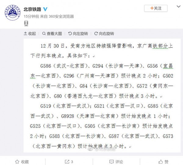 [分享]南方持续强降雪 今天京广高铁部分列车晚点1到3小时