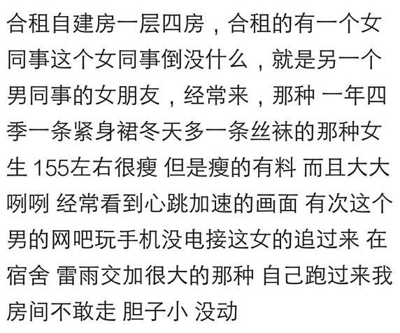 刚毕业那会和两个女孩合租,她们俩一个屋,我一个人一屋此为背景,宽带我掏钱,我是台式机她俩是笔记本,因为台式机大费网,我经常做饭,她俩各种蹭。 好的一点是偶尔还会给买点油盐酱苏,最大的福利和折磨是夏天睡觉都不关门,各种不穿内衣外加单薄睡衣各种漏还不能碰
