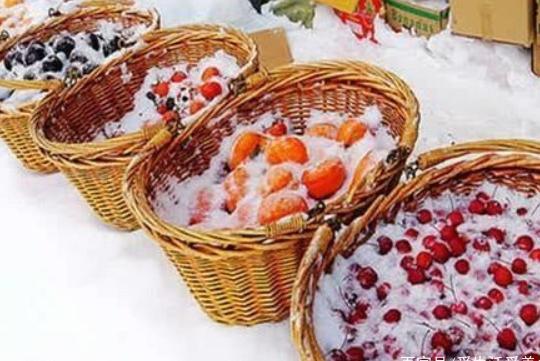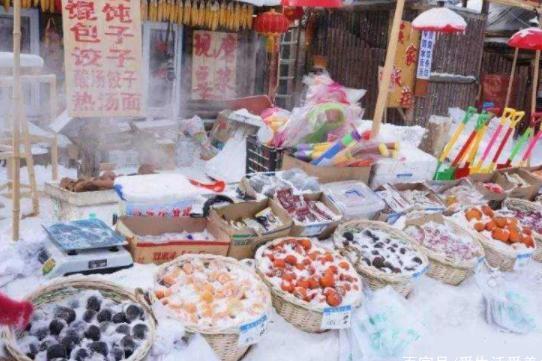 冷冻水果,这是东北的一个特色,而且这种水果也不需要做太大的加工,直接把新鲜的水果放到外面卖,就可以了,一会儿就冻住了,有冻梨,冻柿子,冬草莓各种水果都有。