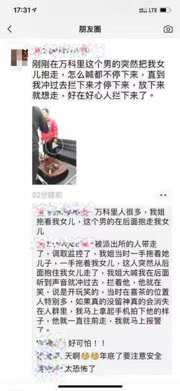 南都讯 深圳苏女士(化名)在微信朋友圈发了一条状态,称1月1日下午她带着女儿和家人逛商场,忽然来了一男子要强行抱走她的女儿,被她拦住后说“我是开玩笑的”。南都记者向龙岗警方了解到,男子已被带回派出所调查。