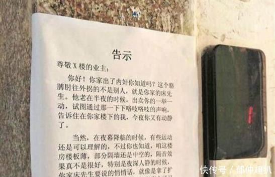 郁仲趣扒“尊敬的X楼的业主你好,很遗憾的通知你,你家出内奸了,他把你所做的一切都告示了我,他就是你家的床”。床变成了内奸,怎么还会有这样的奇闻?仔细了解之后才知道,原来这是一张告示,提醒邻居的某种告示。