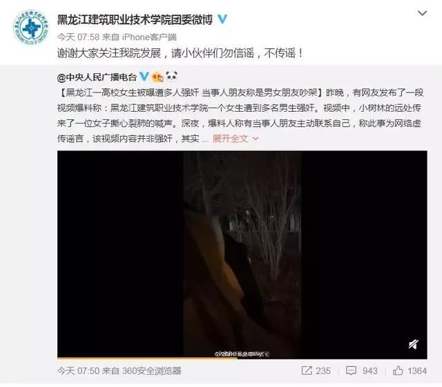 黑龙江建筑职业技术学院团委7日回应,网传黑建筑女生被曝遭多人强奸是谣言,希望大家不要传播谣言。