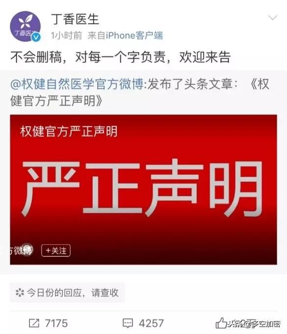 更有意思的是,丁香医生的表现更为硬气,直接对权健的官方答复进行了回怼:“不会删稿,欢迎来告”。