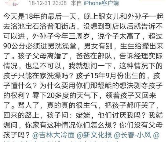12月31日,一名长春市民在 微博 爆料,称在31日当天遇到了一个让人很难接受的事儿,事关自家3周岁外孙到底可不可以进入女浴室洗澡的问题。该爆料内容被 发到各大平台后,瞬间引发网友热议。