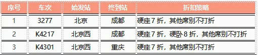 今天,北青报记者从北京西站了解到,目前涉及北京铁路的折扣方案已经出炉,春节前回空方向9趟列车打折,硬座、硬卧、软卧都有涉及,最高可打7折;春节后回空方向3趟列车打折,最高同为7折!