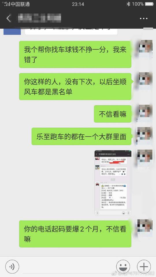 根据小邹提供的"骚扰电话",记者又联系上多位顺风车司机。一名司机明确表示,他是从朋友圈看到,一个取名为"乐至微帮"的网友发出来的"人找车"信息,"说是3号晚上11点半,从双流机场到乐至可包车,信息中留的小邹的手机号。"