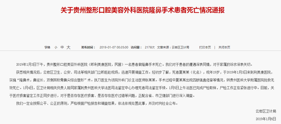 新京报快讯 据云岩区人民政府官网消息,2019年1月3日下午,贵州整形口腔美容外科医院(即利美康医院,民营)一名患者做隆鼻手术死亡。我们对于患者的遭遇深表同情,对于家属的诉求深表关切。